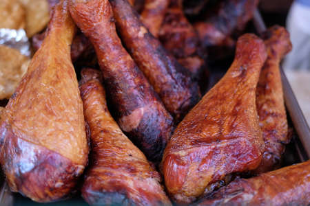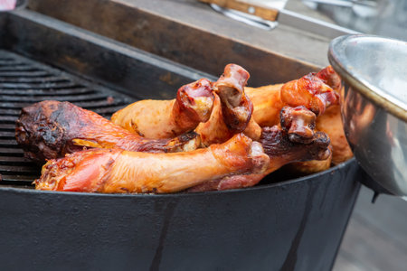 Closeup turkey legs on barbecue grill with smoke. Selective focus