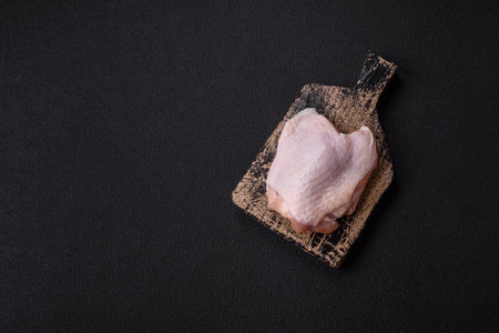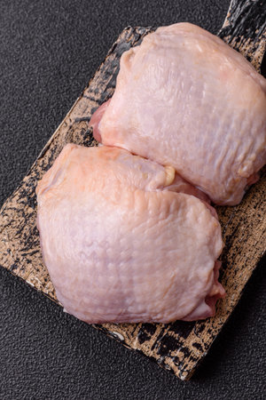 Fresh raw chicken thighs with salt and spices on dark concrete background