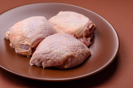 Meat, raw chicken thigh, leg in skin with salt and spices. Raw chicken thigh meat for food background