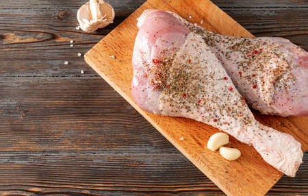 2 Turkey legs with garlic pepper, salt on the kitchen Board close up, wooden brown background,
