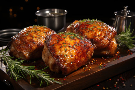 Smoked chicken thighs with rosemary and spices superior view free space for text, generative AI