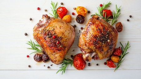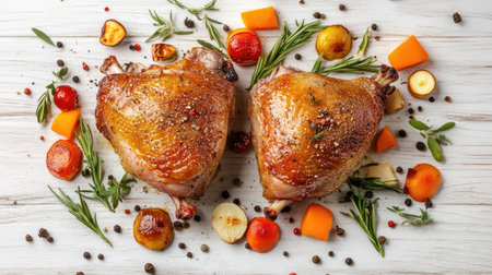 Top view of two perfectly roasted duck thighs with vegetables and spices, placed on a white wooden surface, ideal for food blogs or recipe layouts.