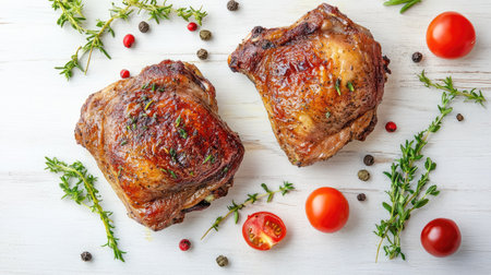 Two crispy duck thighs baked with herbs and vegetables, artfully arranged on a white wooden table. Flat lay, top view for a clean and fresh culinary scene.