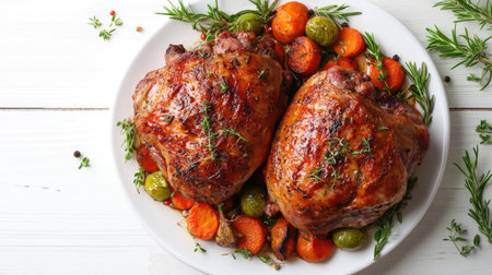 Two perfectly roasted duck thighs with herbs and spices, served with a medley of vegetables, captured from above on a bright white wooden background.