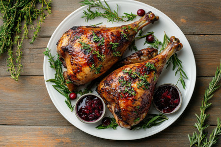 Delicious Roasted Turkey Legs with Cranberry Sauce and Fresh Herbs on White Plates for Festive Thanksgiving Meals, Bundle in Side View and Top View