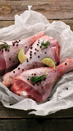Fresh raw turkey legs seasoned with herbs, arranged on a rustic wooden table. Perfect for preparing a delicious meal or festive dinner.