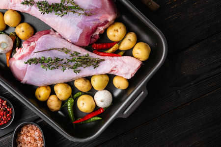 Fresh turkey legs with ingredients for cooking set, on old dark wooden table background, top view flat lay, with copy space for text