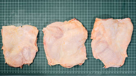 Chicken thigh meat on a linear board. Raw chicken thigh with skin, boneless, for cooking.