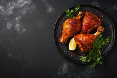 Top view of spicy roasted chicken legs on a plate with a dark background