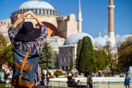 Woman enjoy beautiful view on Hagia Sophia Cathedral, famous islamic Landmark mosque, Travel to Istanbul, Turkey