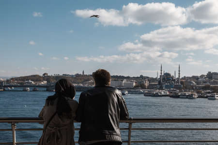 muslim couple hand in hand looking the amazing view of istanbul from the bridge - port with mosque in the background
