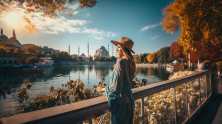 A young woman in a hat on the background of the Blue Mosque in Istanbul, Turkey