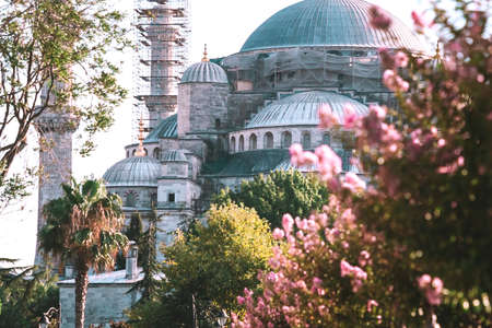 Sultan Ahmed Mosque that also known as the Blue Mosque. One of the most popular sights in Istanbul. View from the garden with pink flowers.