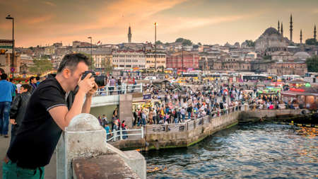 Istanbul, Turkey - May 2013: Photographer photographing Istanbul during sunset in crowded Eminonu district. Istanbul is one of the top tourist destinations in the world.