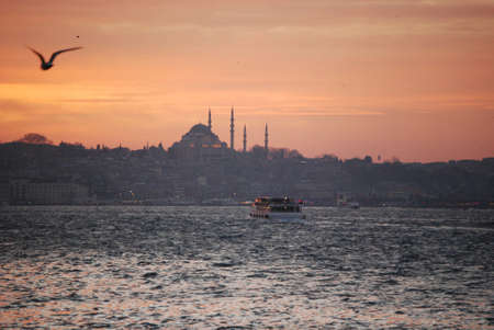 Istanbul, Turkey Historic Ferry Sails Past Majestic Suleymaniye Mosque on Bosphorus Strait.