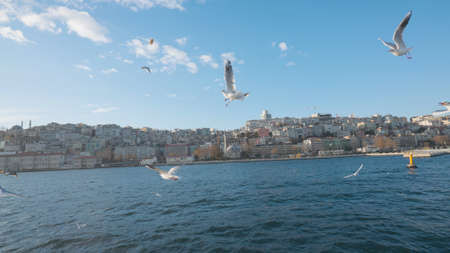 Many white gulls fly on background of sea city. Action. Beautiful gulls fly over water near coast with sea city. Many white gulls fly over water