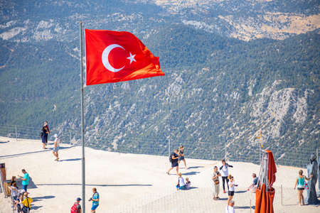 Tahtali, Turkey - 09.09.2020: The flag of Turkey is developing in the wind on top of mount Tahtali in Turkey