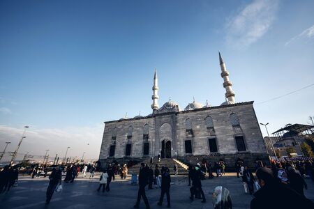 ISTANBUL, TURKEY - NOVEMBER 28: Low angle view of Famous Suleymaniye Mosque and walking people in front in Istanbul against blue sky on November 28, 2014