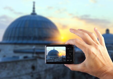 Using a mobile phone camera to take pictures of the Blue Mosque, Sultanahmet in Istanbul, Turkey