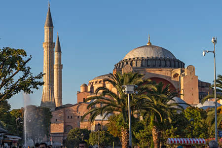 Famous museum Hagia Sophia in Istanbul, Turkey. One of the main sights in Istanbul city center on the sunset. Blue sky and green palms.