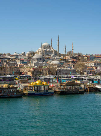 ISTANBUL, TURKEY - APRİL 09, 2020: otantic boats in Eminonu pier on the front and Suleymaniye mosque on the background during The Coronavirus pandemic. Nobody outside. Quarantine and self-isolation.
