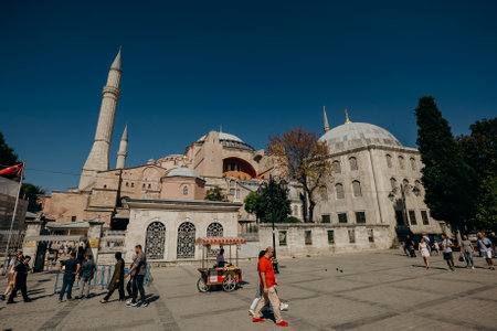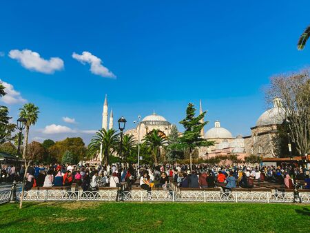 ISTANBUL, TURKEY - AUGUST 12, 2019: Tourists at Ayasofia mosque in Istanbul, The Hagia Sofia is one of the main attractions of the city