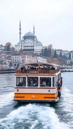 Muslim architecture and water transport in Turkey - Beautiful View touristic landmarks from sea voyage on Bosphorus