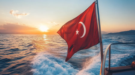 Turkish National Flag Fluttering Against Golden Sunset over Calm Ocean with Copy Space