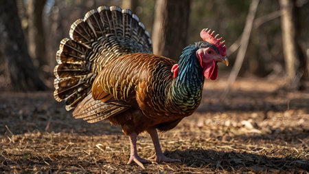 This striking image captures a wild turkey proudly displaying its colorful feathers in a sunlit forest during autumn, evoking a sense of natural beauty and serenity.