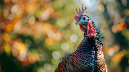 A stunning close-up portrait of a turkey showcasing its vivid feathers and intricate details. This image captures the beauty and texture of this unique bird.
