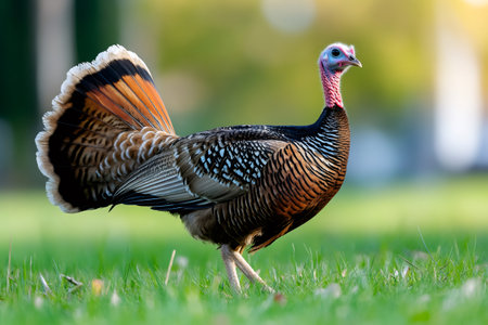 Beautiful wild turkey showing off its colorful plumage walking on a green grassy field