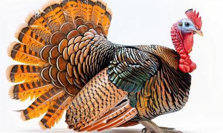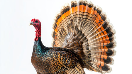 A wild turkey in full display mode, with feathers fanned out and head held high, set against a stark white background to highlight its colorful plumage.