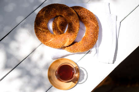 Traditional Turkish sesame bagel simit and Turkish tea on white wood background with hard sun light shadows on street.Top view.