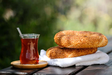 Traditional Turkish sesame bagel simit and Turkish tea on wood background with hard sun light shadows on. street food. Tasty breakfast. Nature background, bokeh