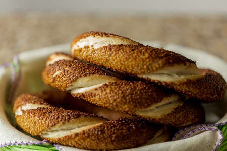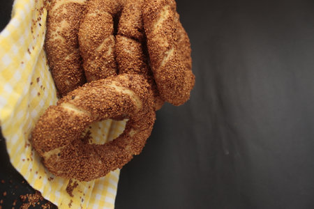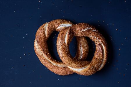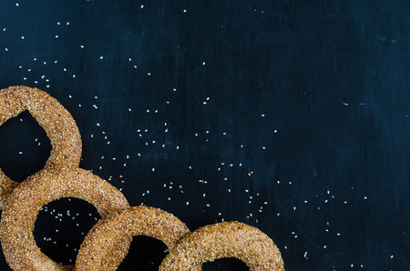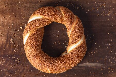 Traditional Turkish crispy bagel with sesame, simite. Freshly baked buns. View from above. Sweet homemade pastries. Breakfast. Background. Food.