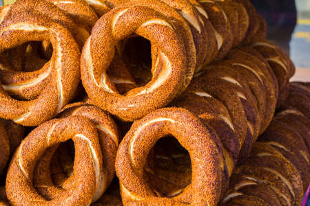 Traditional delicious street food Simit. Background from Turkish sesame bagels