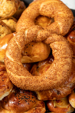 Variety of delicious Turkish bagels with sesame seeds and cereals.