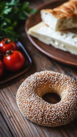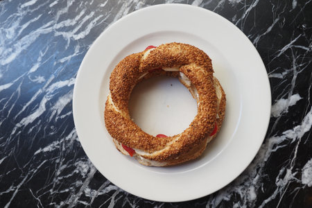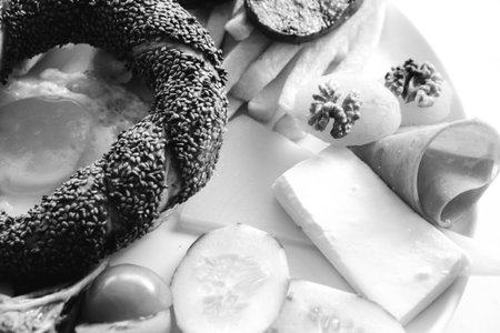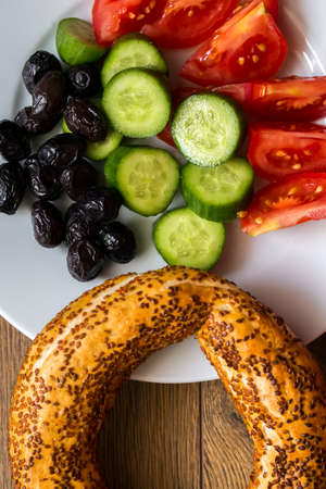 Traditional Turkish breakfast with Turkish bagel with cheese and tomatoes (Turkish name; bagel or crispy)