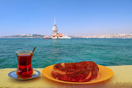 Turkish bagel simit and maidens tower in Istanbul, Turkey