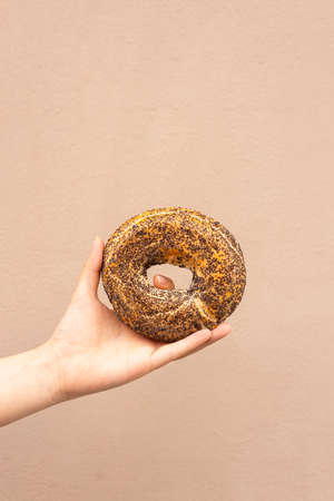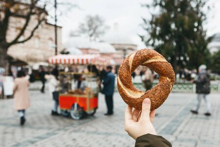 A person is holding a traditional Turkish bagel Simit on the background of a street stall selling Simites. Turkish fast food.