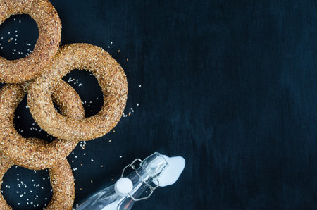 Turkish simit bagel dusted with sesame and spilled milk from a bottle on a black background. View from above. Banner background with copy space
