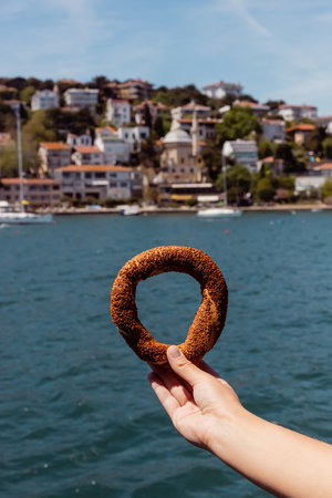 Turkish simit in hand with bay in background. Hot sesame bun with sea in background.