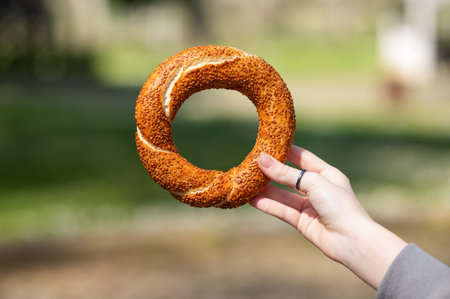Hand holding sesame covered simit bread against blurred park on sunny day symbolizing traditional street food culture. Istanbul, Türkiye.