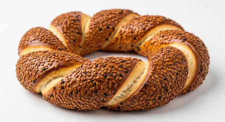 A delicious ring shaped bread generously coated with toasted sesame seeds.