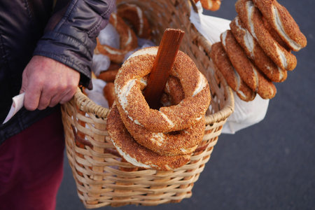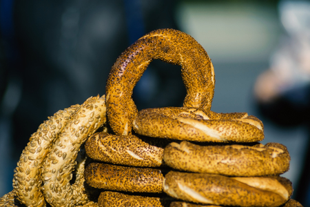 Turkish bread simit. Traditional baked bagel in Turkey sold as street food and eaten with tea for breakfast or lunch. high quality photo