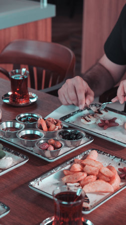 Rich traditional Turkish breakfast spread with cheeses, olives, sausages, tomatoes, cucumbers, pastries, jams and black tea in tulip glasses, hands serving food