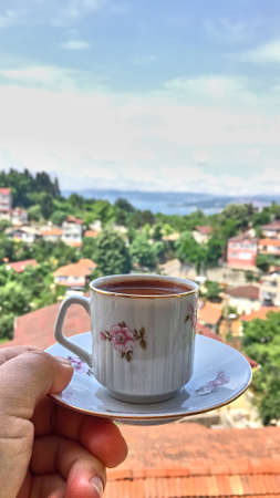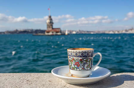 Cup of coffee in front of the Maiden's Tower in Istanbul, Turkey