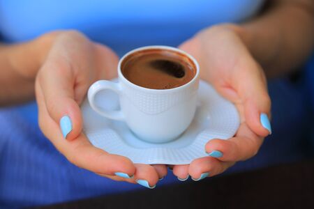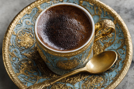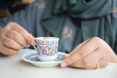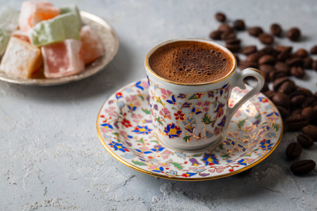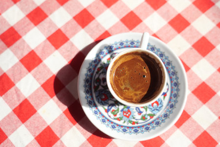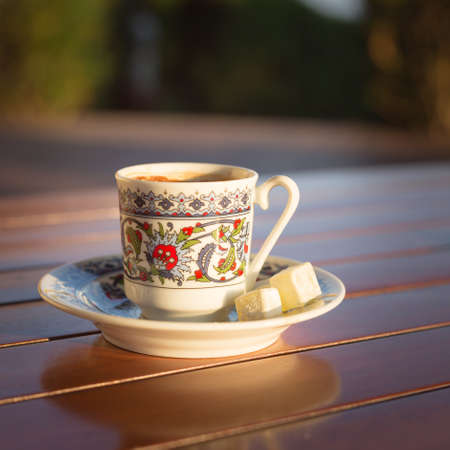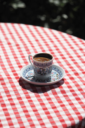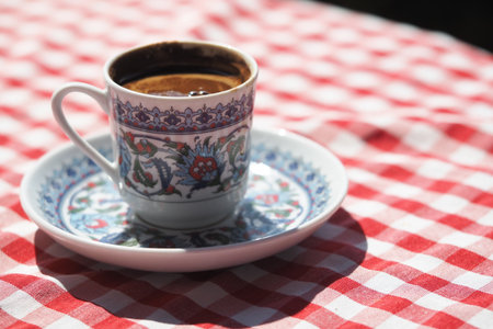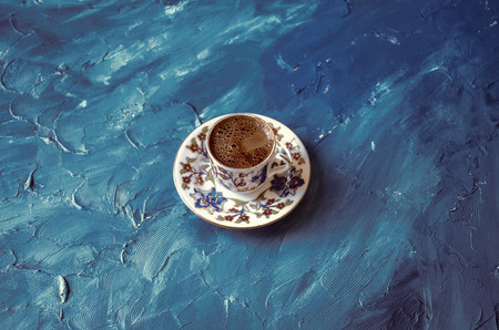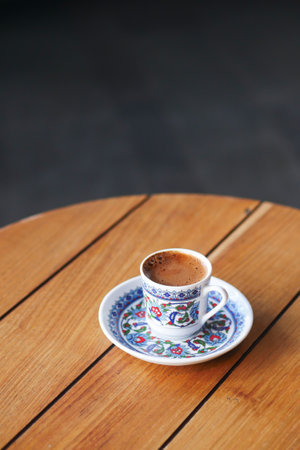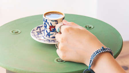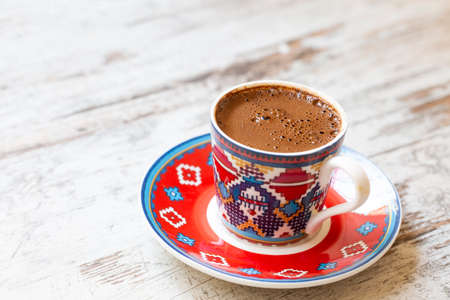 Turkish hot coffee in traditional painted cup close up view on the table in cafe