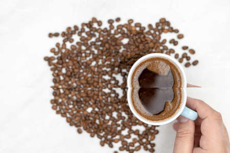Cafes and restaurants. A mug of invigorating, black coffee with heart shaped and coffee beans. Place for an inscription. The concept of hot drinks and love.