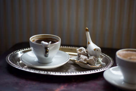 Traditional Turkish coffee with cold water and Turkish delight in cafe. Selective focus